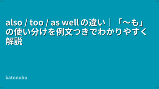 英語の使い方 also / too / as well の違い|「〜も」の使い分けを例文つきでわかりやすく解説 also、too、as well はどれも「〜も」という意味ですが、位置やニュアンスに違いがあります。この記事では、also / too / as well の違いを初心者向けに整理し、使い分け方を例文つきでわかりやすく解説します。 2026.04.18 英語の使い方